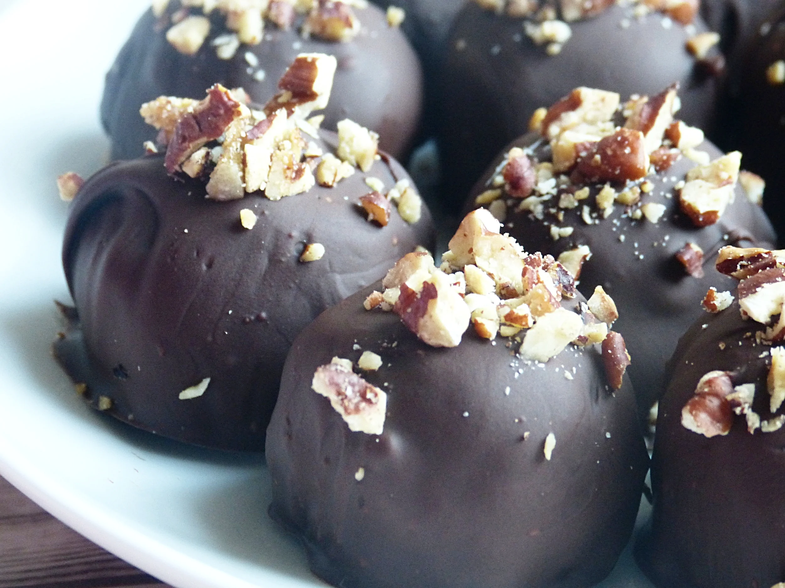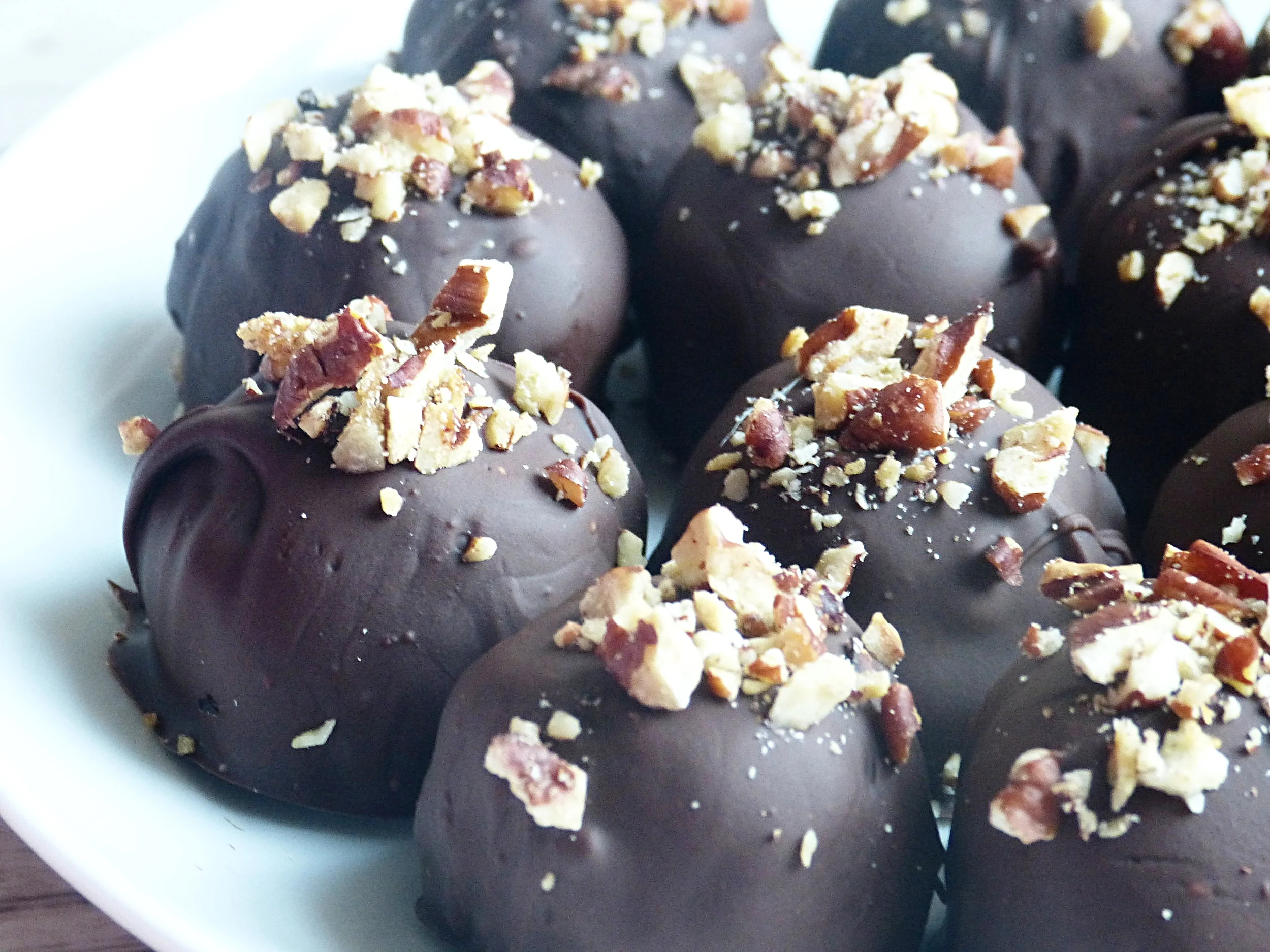 Step 6: One by one, coat the balls with chocolate, place back on wax paper and sprinkle with the chopped toasted pecans set aside.